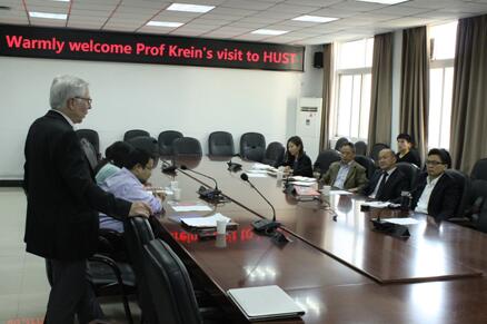 在为期两天的来访中,Krein教授与电气学院的教师以及国际交流处进行了多场交流,既包括学科建设和研究方向的交流,也包括国际化办学和国际校区建设和管理的内容。Krein教授在李亮教授等老师的陪同下先后参观了国家脉冲强磁场中心,中美联合可控聚变实验室,电力系统动态模拟实验室,创新电机技术研究中心和电力电子中心实验室等。等4月19日下午,Krein教授还就光伏发电和交通电气化两个专题对电气与电子工程学院师生做了两场精彩的学术报告。