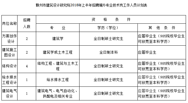 根据工作需要,赣州市建筑设计研究院现编制外面向社会共公开招聘10名专业技术工作人员。具体实施方案如下: