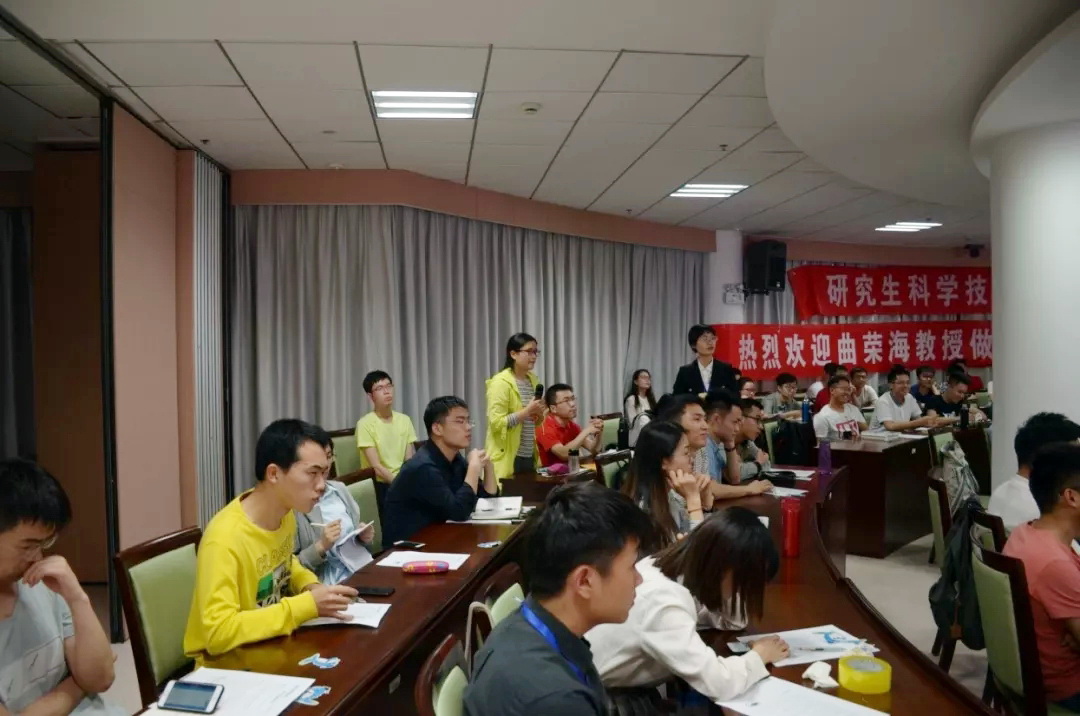 曲教授的深入浅出的讲解赢得了同学们的阵阵掌声,同学们也相继拍下了干货满满的幻灯片,留待会后整理笔记。多位同学积极发言,向曲教授提问,曲教授也都一一耐心的做了解答。报告结束后,很多同学依旧留下来与曲荣海教授进行沟通交流,提出科研中的困惑,曲教授非常热情地与同学们单独交流经验。伴随着同学们的离场,研科协优博论坛论坛第44期讲座也圆满地划上句号。